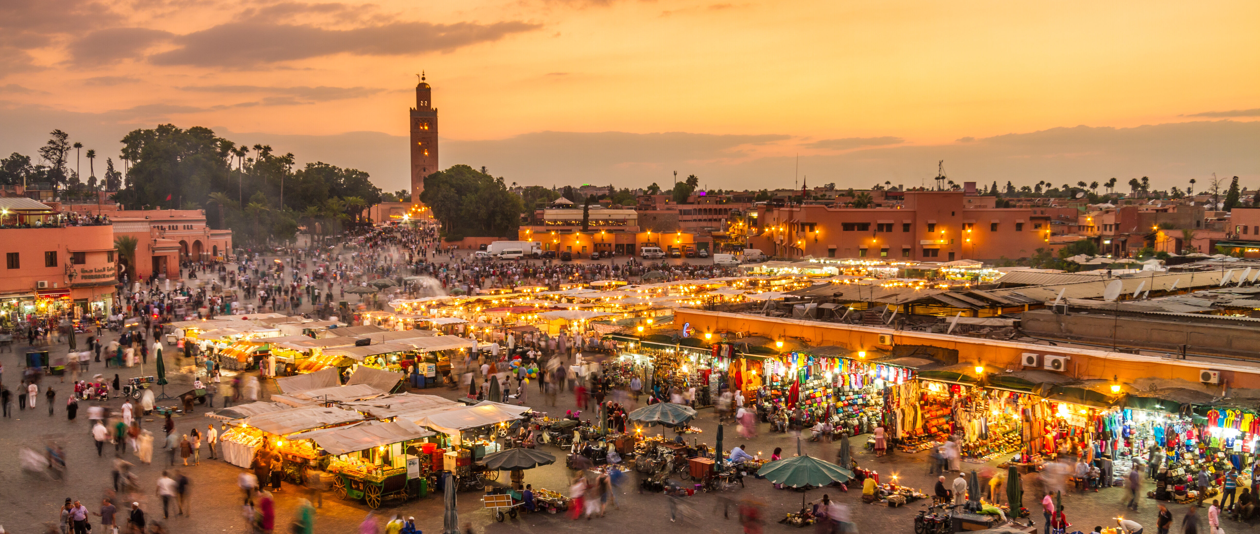 Het beroemde Djemaa El Fna plein komt vooral 's avonds tot leven. Slangenbezweerders, verhalenvertellers en straatverkopers creëren een unieke sfeer die je nergens anders ter wereld vindt. Proef lokale lekkernijen van de vele eetkraampjes, zoals verse tajine en verse, jus d'orange terwijl de zon ondergaat boven de stad. Pas om voor de dames die henna tatoeages aanbieden, je hebt hem voordat je er erg in hebt.