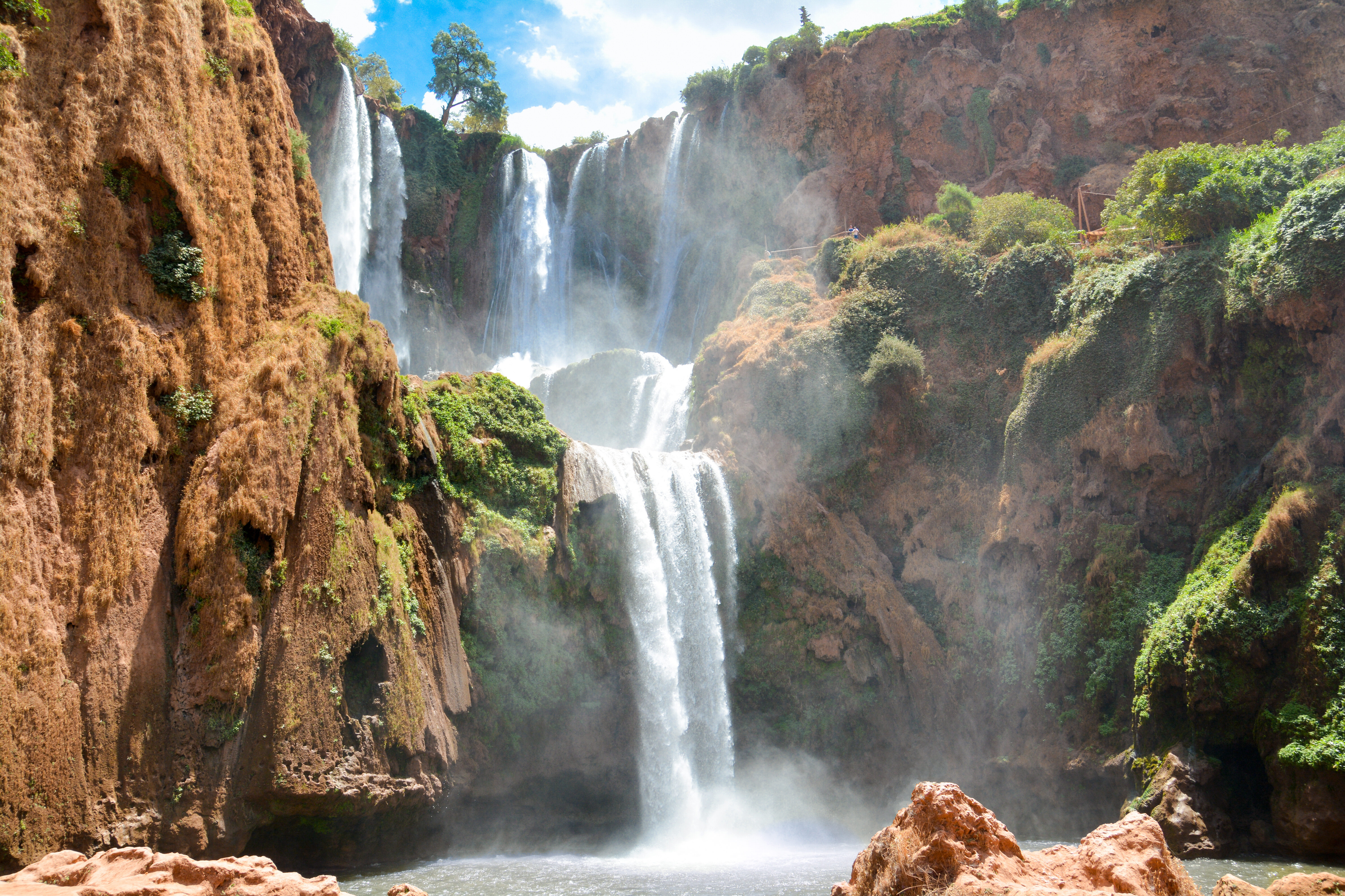 De Ouzoud-watervallen, gelegen op ongeveer 2,5 uur rijden van Marrakech, behoren tot de hoogste en meest indrukwekkende watervallen van Marokko. De watervallen storten zo’n 110 meter naar beneden in een weelderige kloof omringd door groene vegetatie, en vormen een prachtig contrast met de omliggende rotsachtige landschappen.