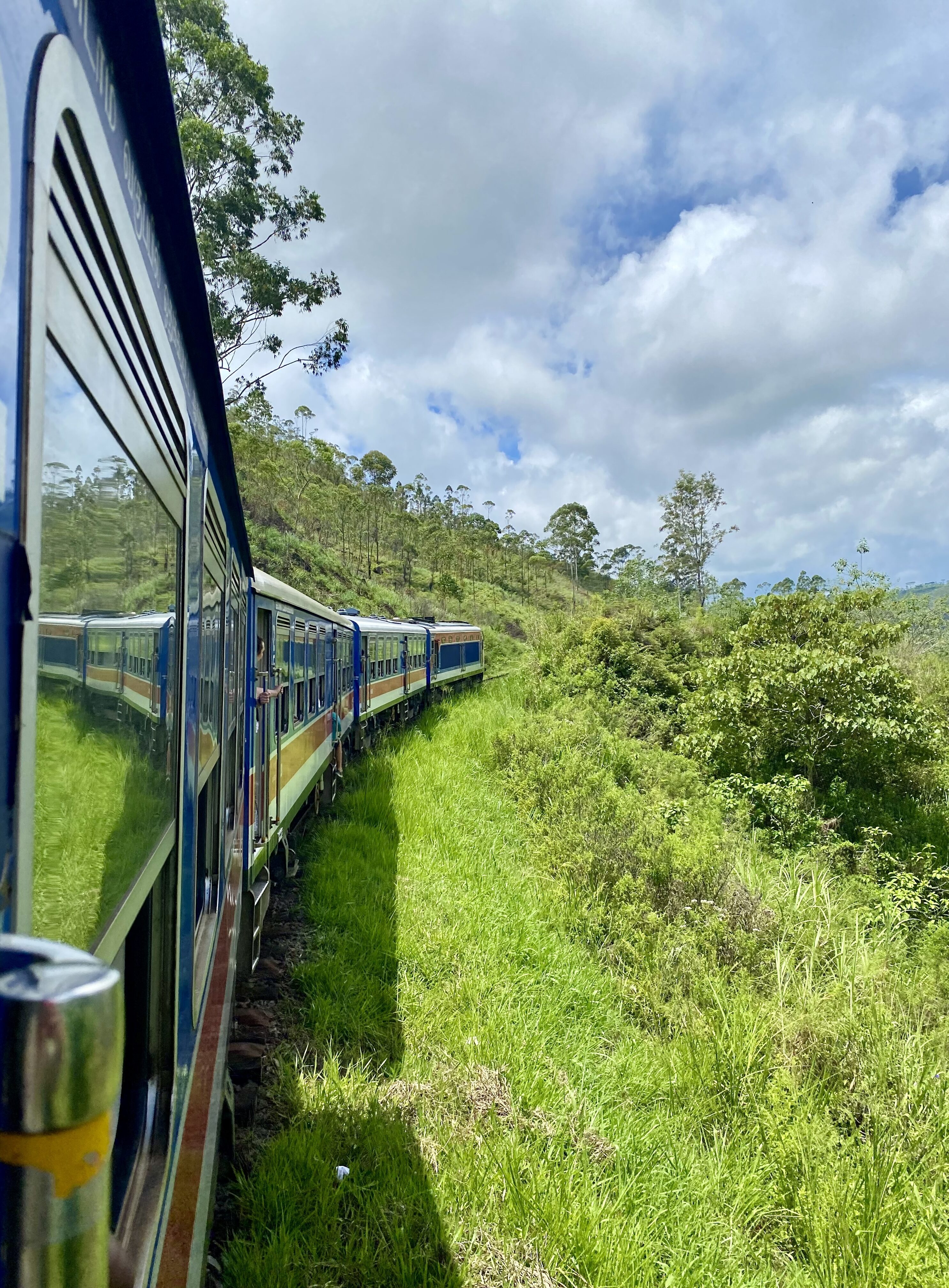 We hadden ons strategisch aan de linkerkant van de trein gepositioneerd, maar al snel bleek de rechterkant nog indrukwekkender. Gelukkig konden we dankzij de open ramen volop genieten van de adembenemende uitzichten over de groene theeplantages en glooiende heuvels.